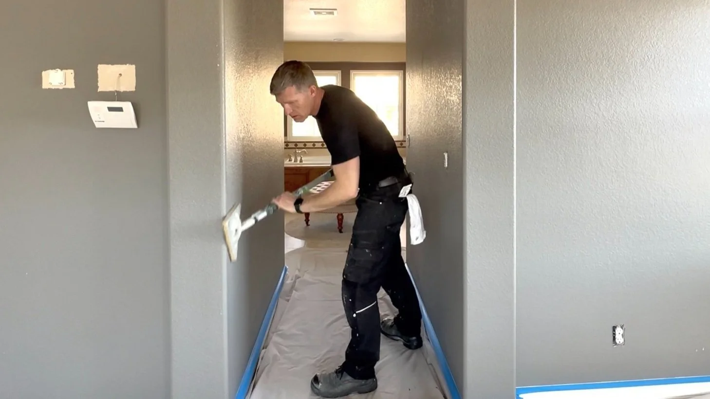 Even textured walls can have imperfections, high spots, and stray drywall fibers that become more noticeable once painted. A quick pole sanding with a medium-grit sandpaper helps smooth these minor flaws for a cleaner finish.